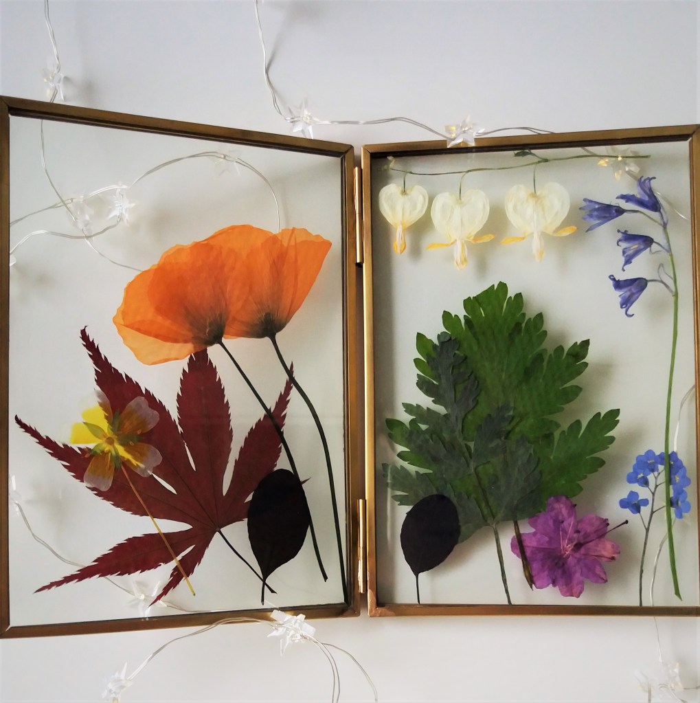 Well with a stroke of luck, we have a spare glass frame tucked away in a cupboard so I have decided to make a fancy botanical frame with my pressed flowers. It was pretty easy actually. I just set the pressed botanicals in an arrangement I liked and bolted the frame.